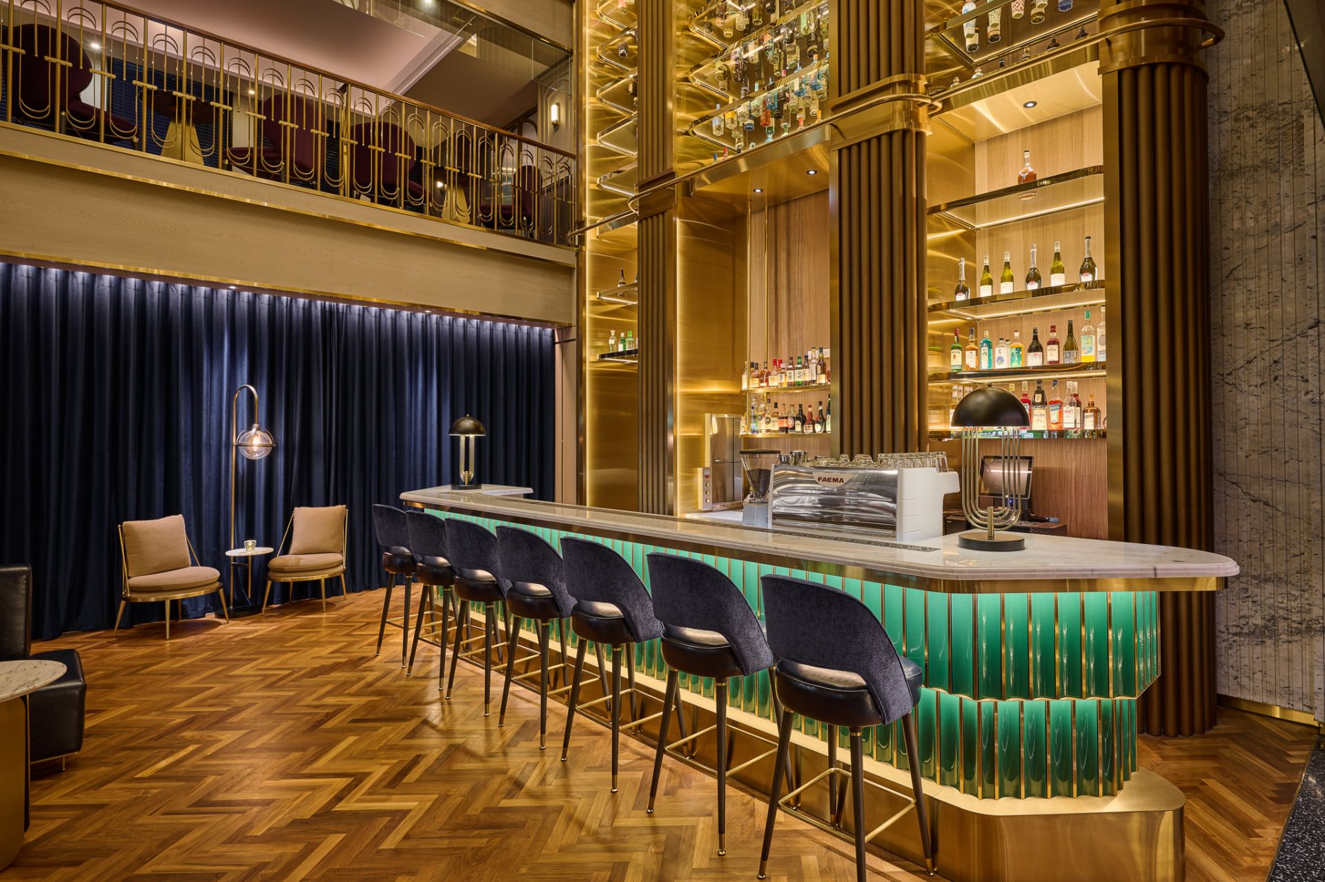 館內共 80 間客房,以復古與當代交織的語彙鋪陳細節;挑高 三層樓酒塔 成為夜晚的視覺核心,映照每一次舉杯的光影。